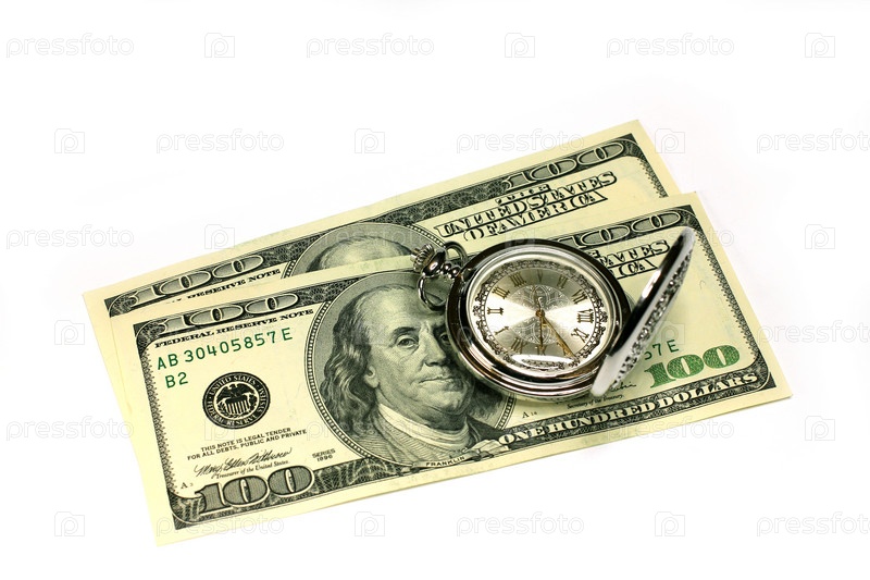 Часы и стодолларовая купюра как символ финансов
