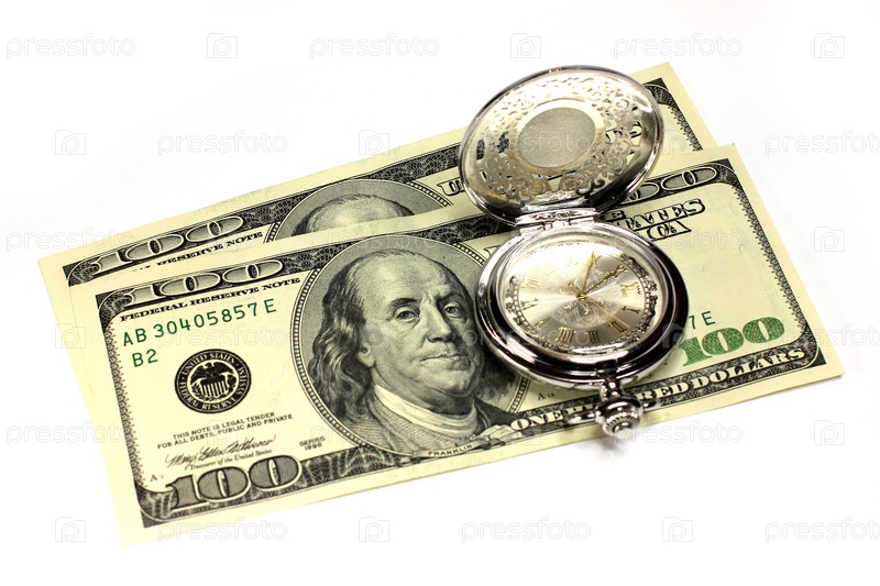 Часы и стодолларовая купюра как символ финансов
