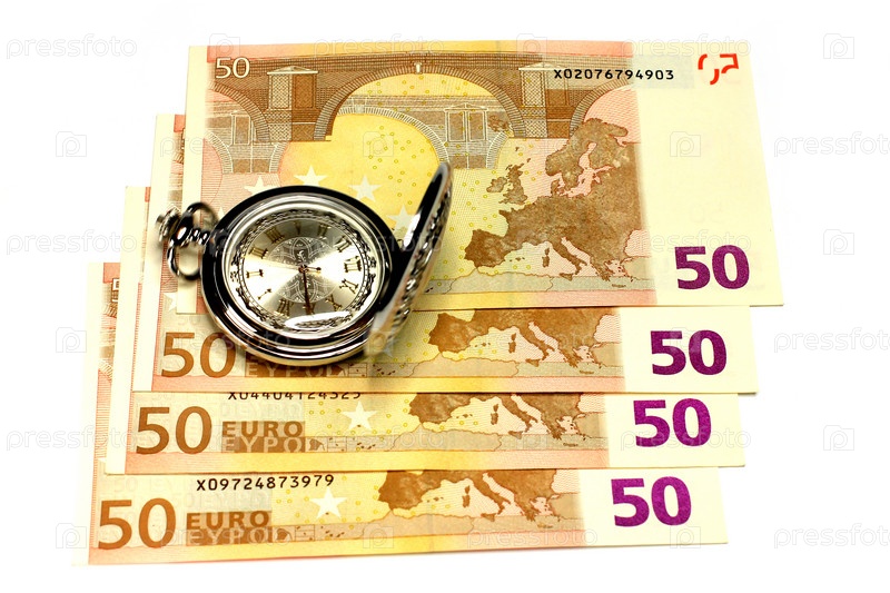 Часы и купюры евро как символ финансовой деятельности