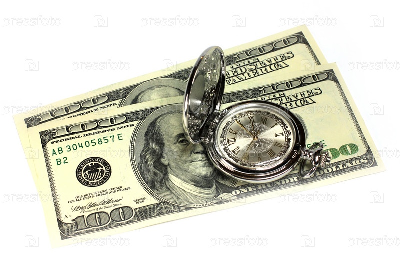 Часы и стодолларовая купюра как символ финансов