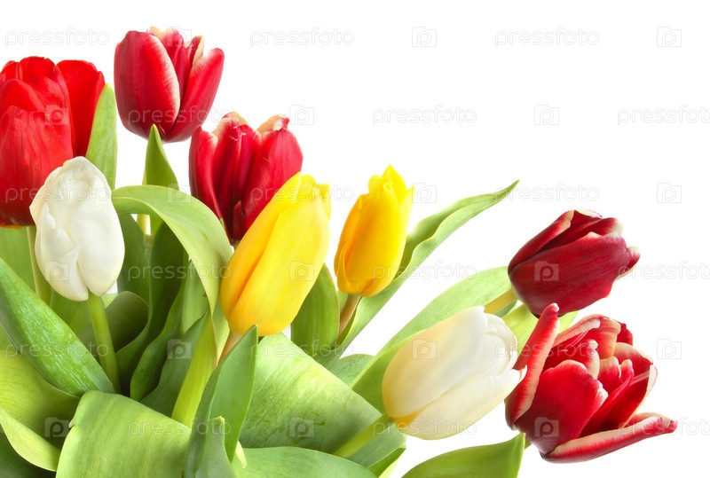 Цветные весенние тюльпаны на белом фоне