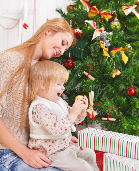 Мать с дочерью у новогодней елки