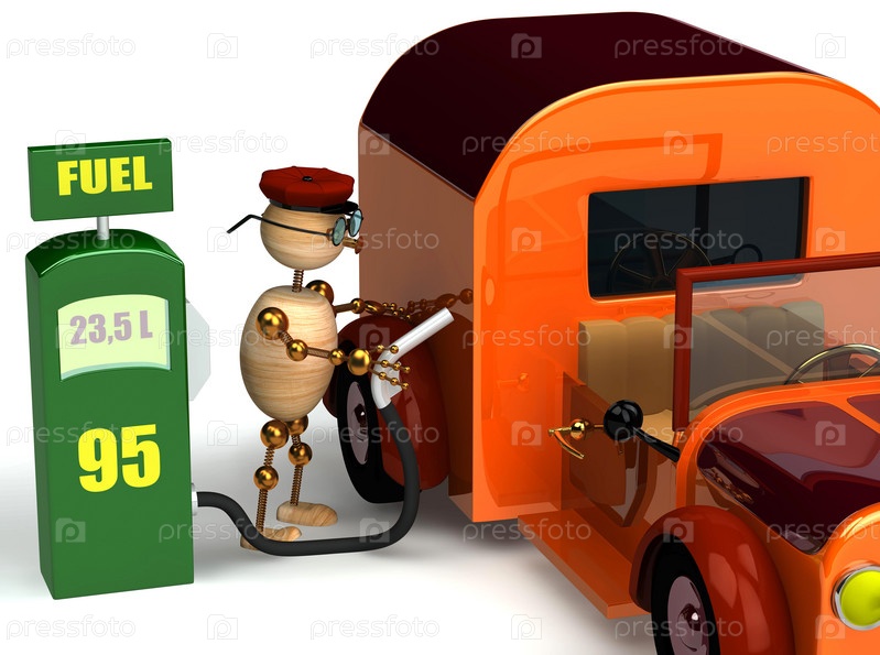 Иллюстрация с изображением деревянного человечка, заправляющего автомобиль