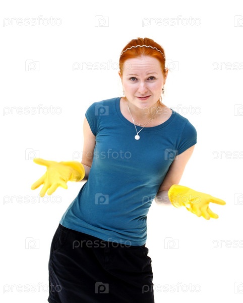 Симпатичная молодая домохозяйка в желтых перчатках на белом фоне