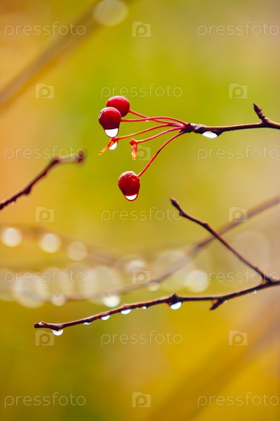 Осенью ветви дикой яблони под дождем