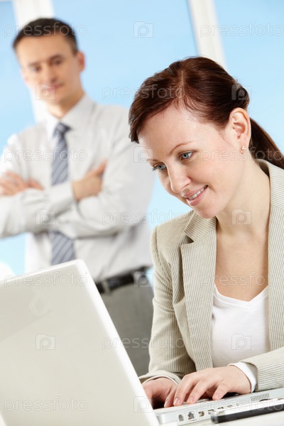 Руководитель наблюдает за выполнением сотрудницей поставленной задачи