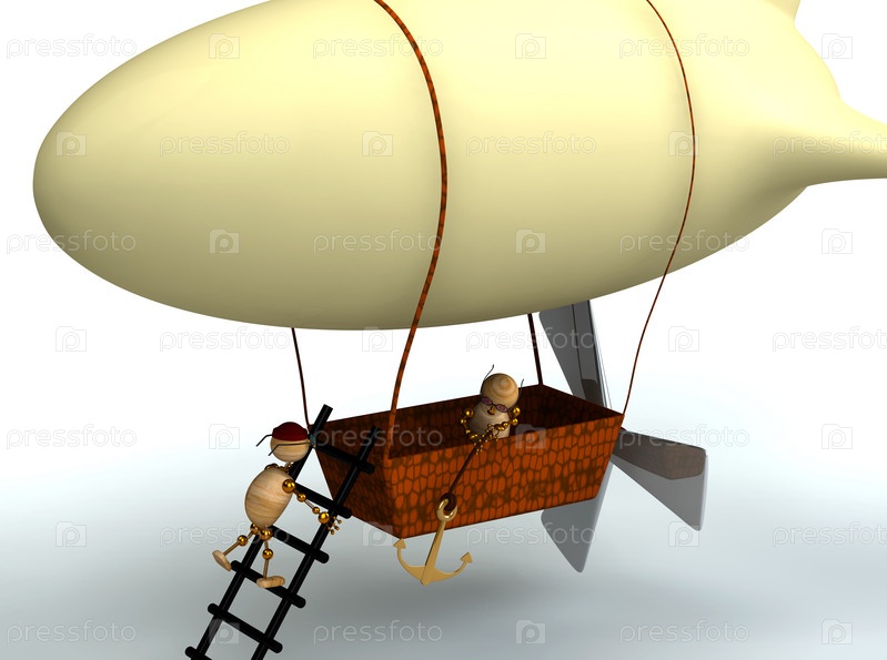 Дирижабль и стилизованные человечки-пилоты на белом фоне