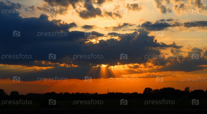Лучи заходящего солнца пробиваются сквозь хмурые облака