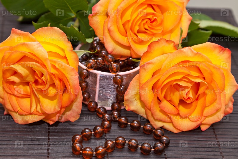 Желтые розы и жемчужные бусы лежат на бамбуковой скатерти