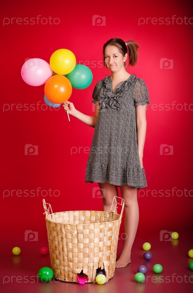 Смешная девушка с игрушками и воздушными шарами на красном фоне