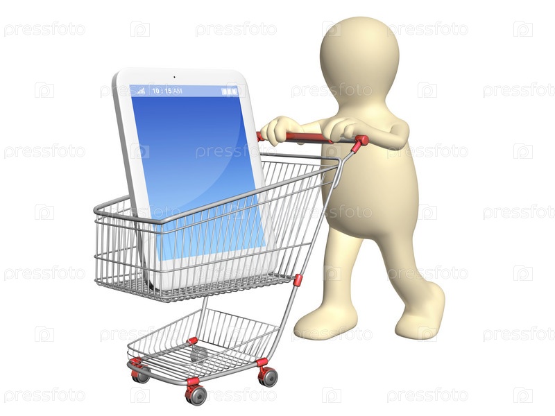 3D кукла с корзиной для покупок и смартфоном