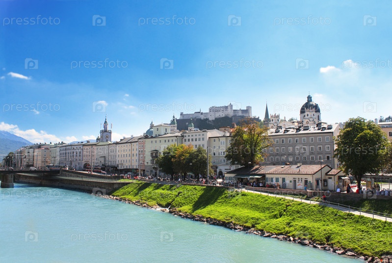 Вид на город Зальцбург и реку Зальцах, Австрия