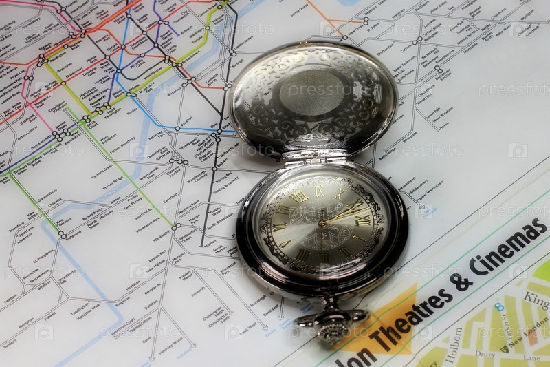 Точные часы и географическая карта как символ выбора направления путешествия