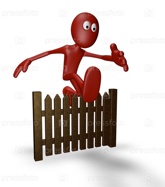 Маленький человек прыгает через забор - 3D иллюстрация