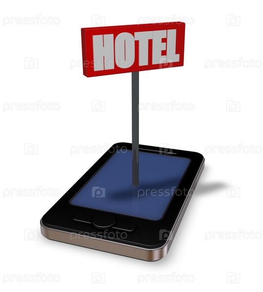 Смартфон с вывеской отеля, 3d иллюстрация
