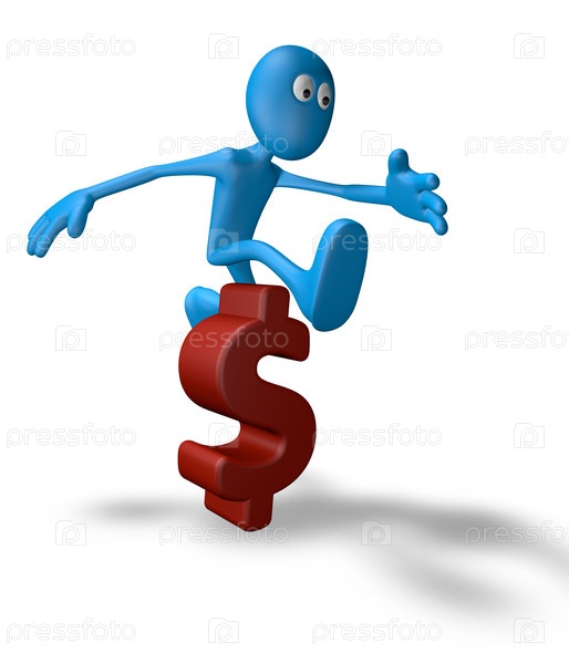 Маленький человек перепрыгивает через доллар - 3D иллюстрация