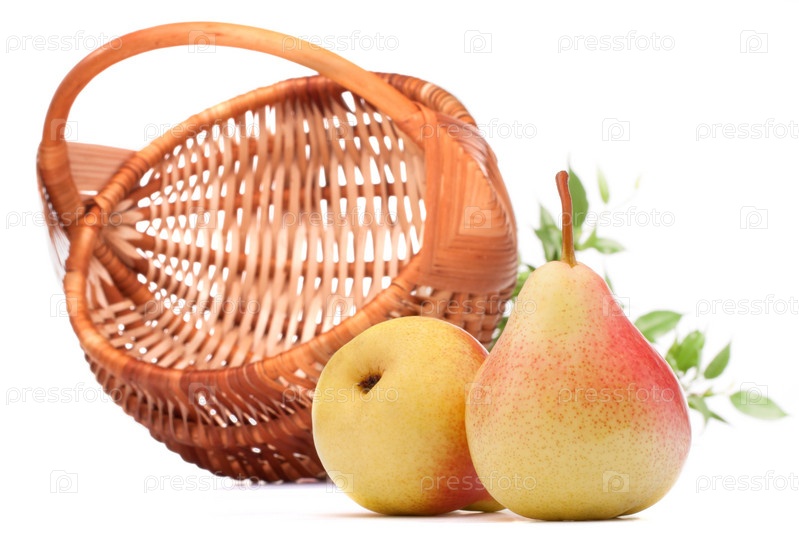 Груши и плетеная корзина, изолированные на белом фоне. Осенний урожай