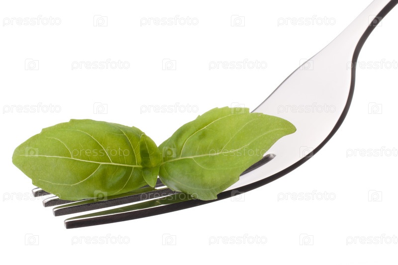 Свежий лист базилика на вилке, изолированный на белом фоне. Здоровое питание
