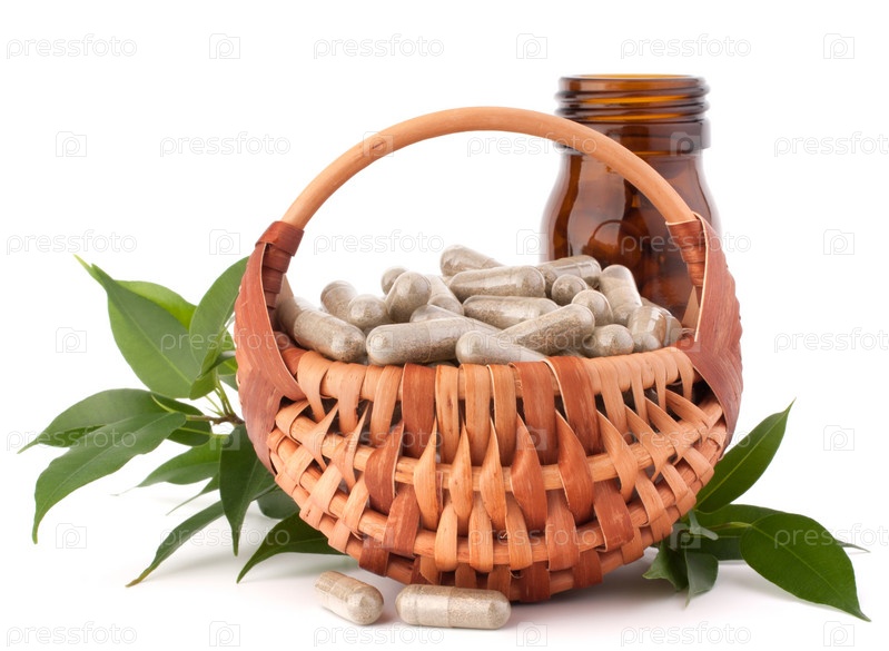 Травяные капсулы в плетеной корзине. Концепция альтернативной медицины