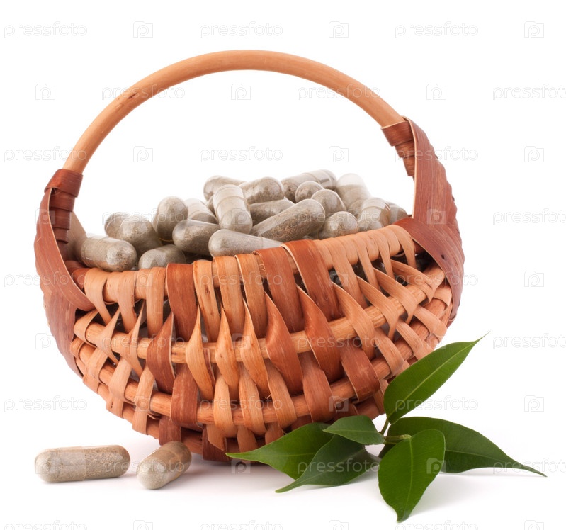 Травяные капсулы в плетеной корзине. Концепция альтернативной медицины