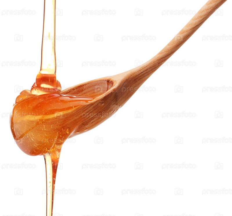Мед капает с деревянного ковша, изолированный на белом фоне
