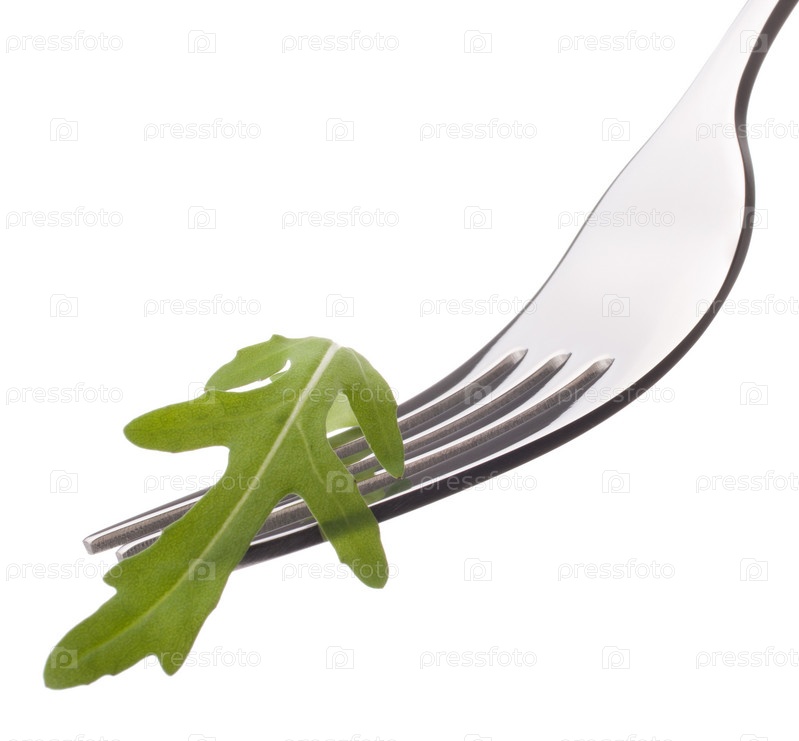 Свежийсалат руккола на вилке, изолированный на белом фоне. Здоровое питание