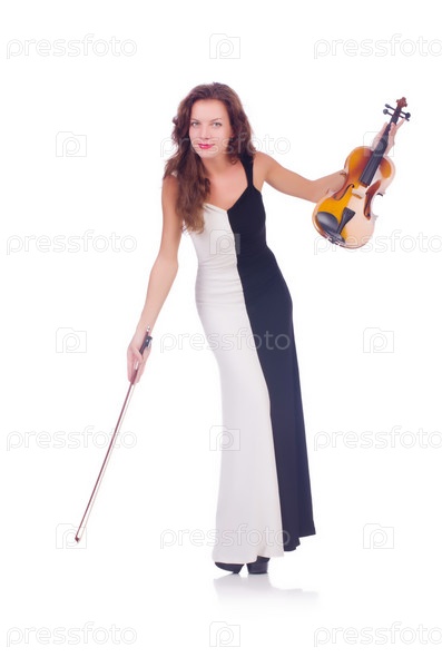 Молодая девушка со скрипкой на белом фоне