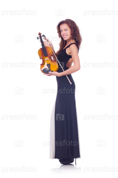 Молодая девушка со скрипкой на белом фоне