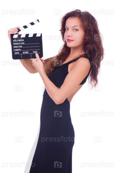 Женщина с кинохлопушкой, изолированная на белом фоне