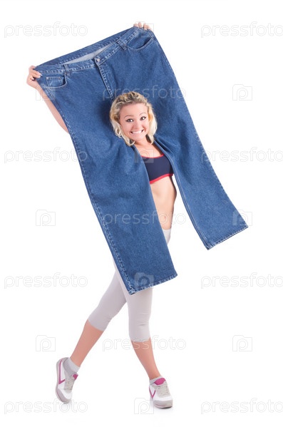 Женщина с большими джинсами в концепции диеты