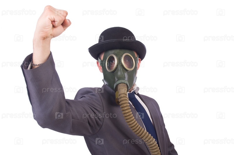 Бизнесмен в противогазе, изолированный на белом фоне