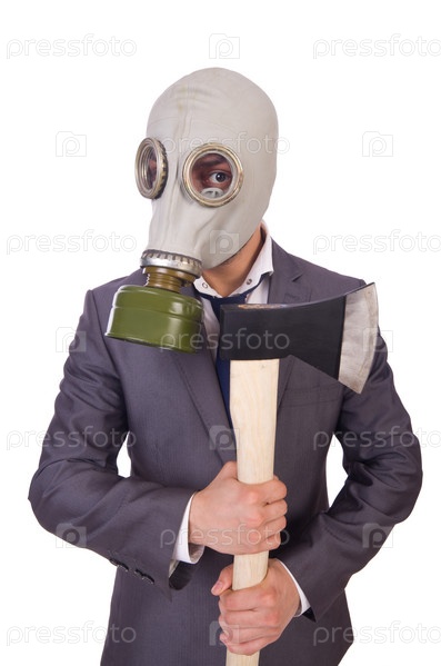 Бизнесмен в противогазе, изолированный на белом фоне