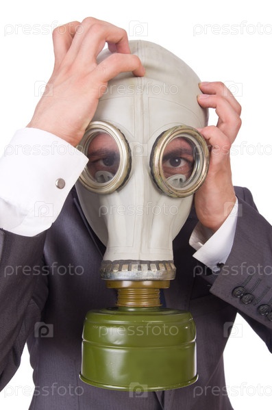 Бизнесмен в противогазе, изолированный на белом фоне