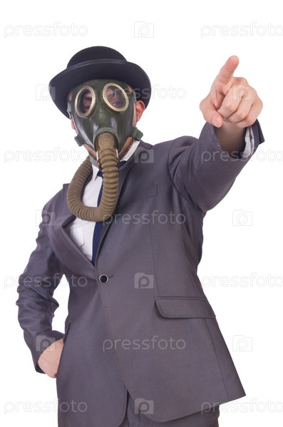 Бизнесмен в противогазе, изолированный на белом фоне