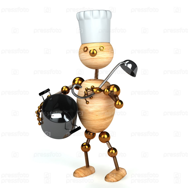 Деревянный человечек в поварском колпаке с кастрюлей и половником