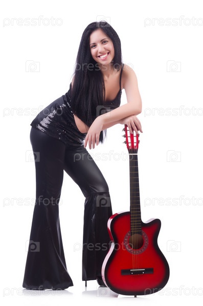 Женщина с гитарой, изолированная на белом