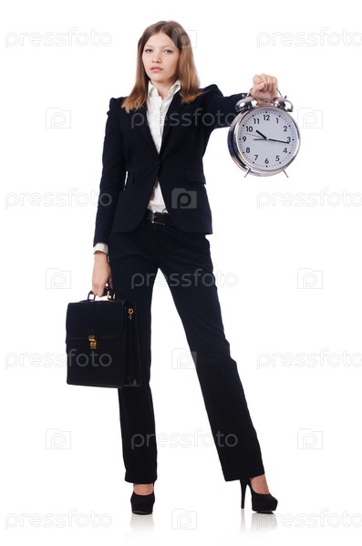 Бизнес-леди с часами, изолированная на белом фоне
