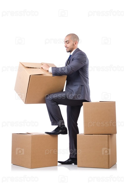 Бизнесмен с коробками, изолированный на белом