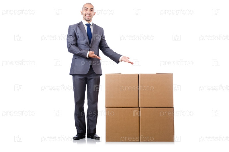 Бизнесмен с коробками, изолированный на белом