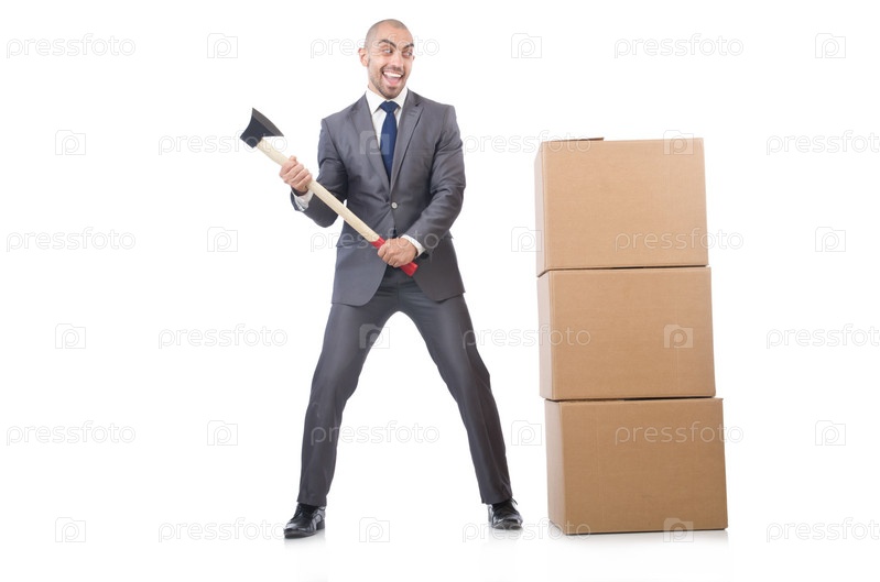 Бизнесмен с топором и коробками, изолированный на белом