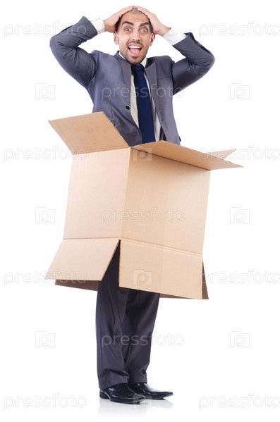 Бизнесмен с коробками, изолированный на белом