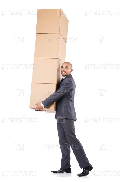Бизнесмен с коробками, изолированный на белом