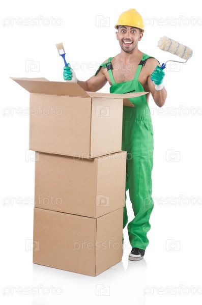 Человек в комбинезоне с коробками