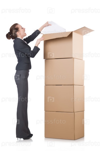 Бизнес-леди с коробками на белом фоне