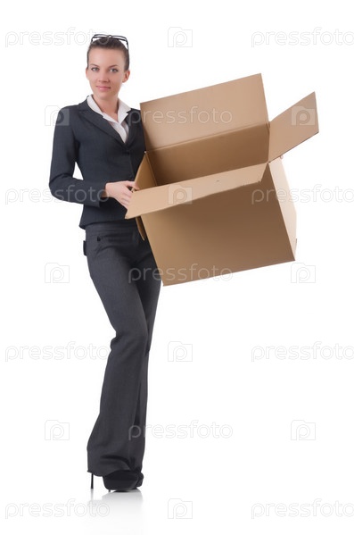 Деловая женщина с коробками на белом фоне