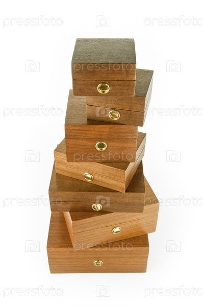 Куча старинных деревянных коробок, изолированных на белом фоне