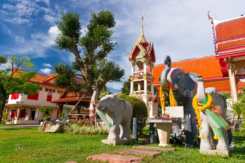 Статуи слонов в ритуальных лентах и венках, Тайланд