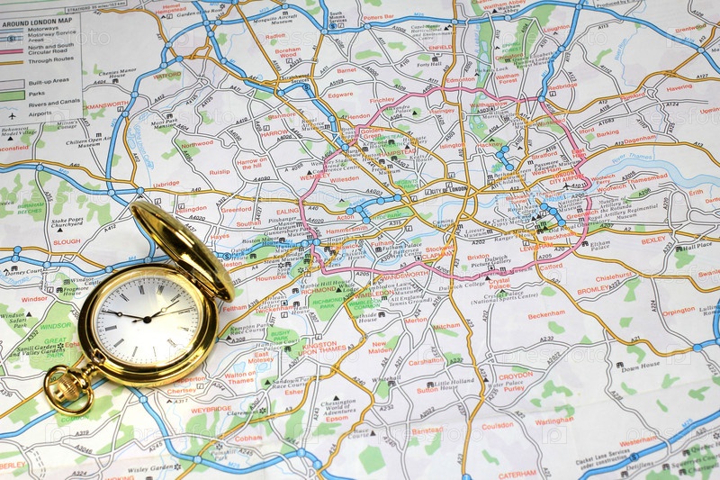 Часы и географическая карта как символ выбора направления путешествия
