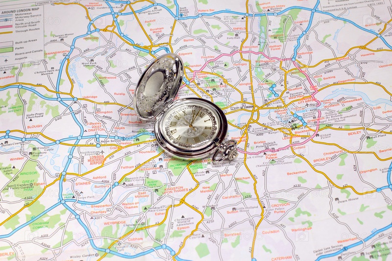 Часы и географическая карта как символ выбора направления путешествия