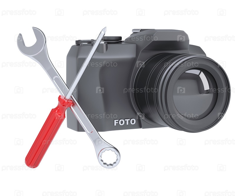Зеркальная камера, отвертка и гаечный ключ